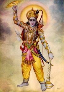 Meaning: He holds the thunderbolt and flag and adorns the janeu(sacred thread) on his shoulders